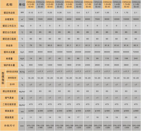 注:1、表中采暖面積系建筑面積。供暖設計指標以遼寧省地區(qū)氣候為準,同型號鍋爐在高寒地區(qū)使用,取暖面積視情況折減。
